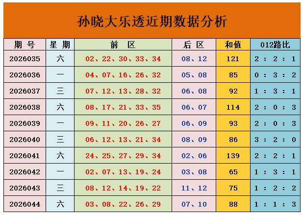 上期回顾:大乐透第2026044期奖号:前区03、08、22、26、29,后区07、10网上投注app,前区奖号和值为88,012路比为1:1:3,后区开出大大组合07、10